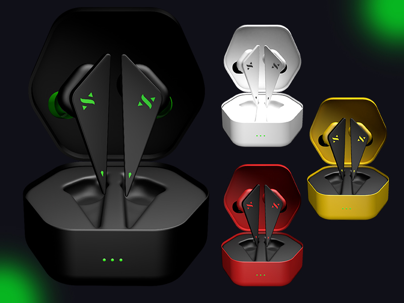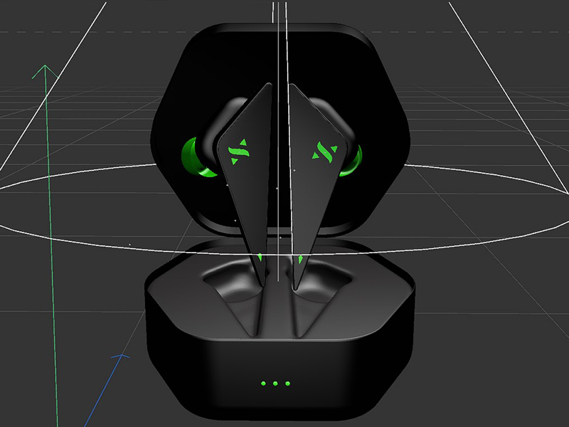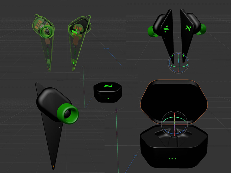 The final deliverable is a high-quality 3D model of the earbuds, showcasing their unique triangular design, breathing logo effect, and Bluetooth LED light in an aesthetically striking black-and-green color scheme with variations in white, red, and yellow. The model is rendered with realistic textures and lighting in Cinema 4D, ready for use in promotional materials, animations, and interactive presentations to highlight the earbuds’ modern design and functionality.